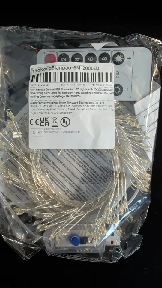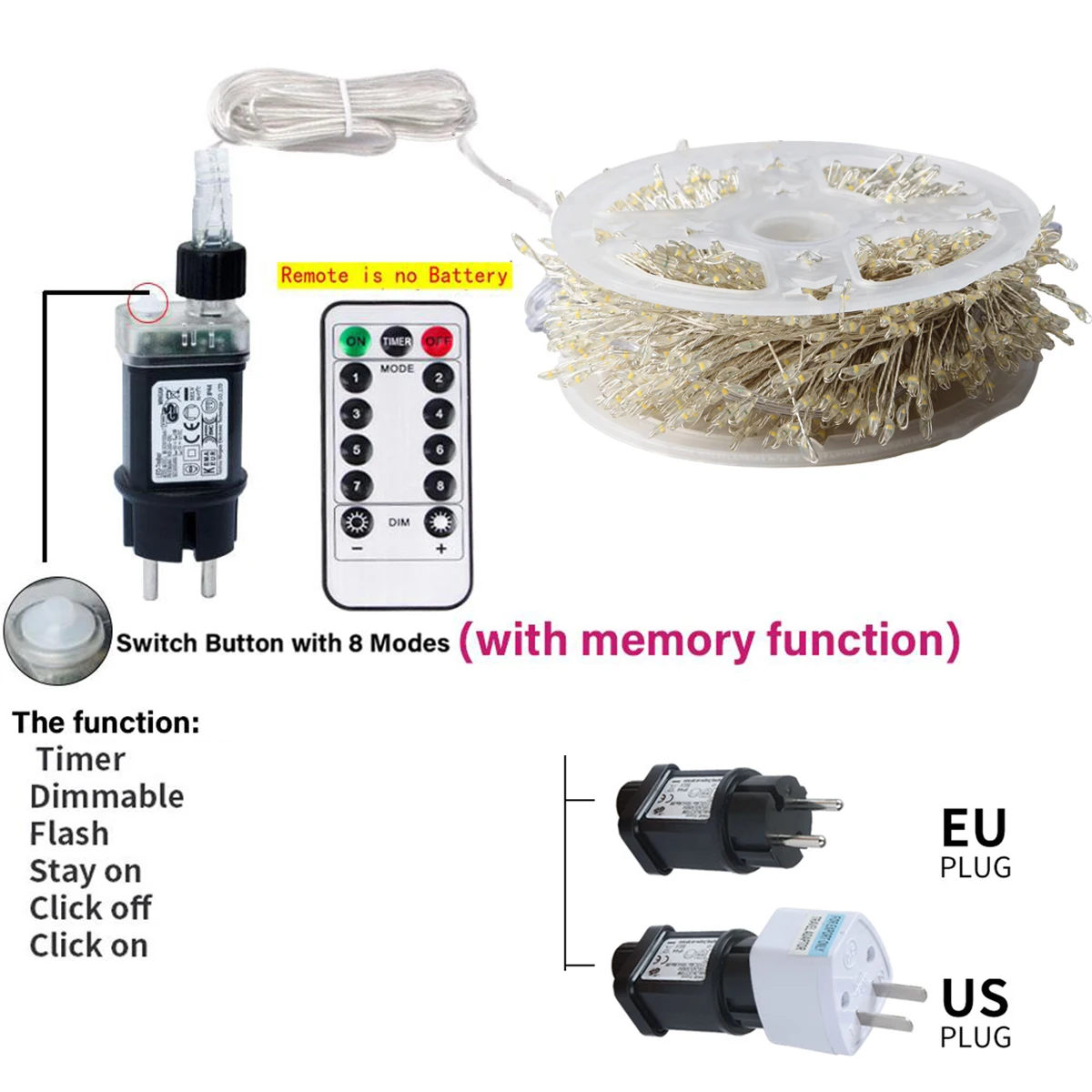 | Controls | Dimmable, 8 Modes, Remote Control (battery excluded) |