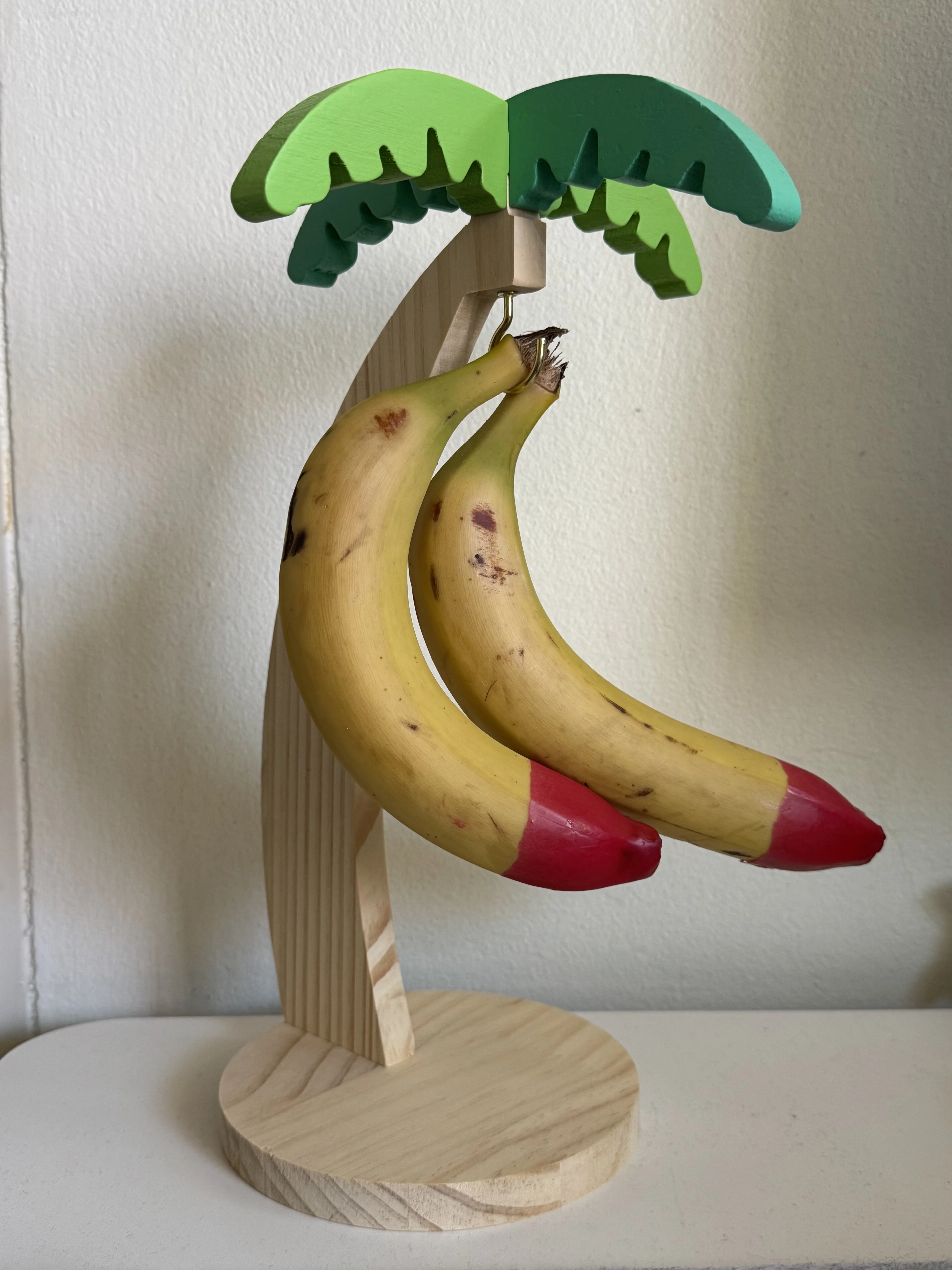 This vertical storage rack combines functionality with a tropical design. Made from natural wood, the stand features the simulated shape of a banana tree, with vibrant green leaves at the top and a solid, stable base. The main benefit is the metal hook that allows you to hang the bunch, mimicking natural growth, which reduces surface contact and slows down the ripening process. It's the ideal item for modern kitchens, countertops, and coffee stations.